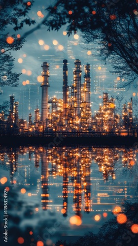 Night view of refinery reflected in calm water, illuminated structures and bokeh effect