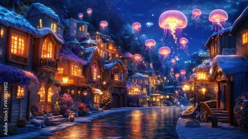 Night, village, snow, jellyfish, river, fantasy, winter, illustration, whimsical, art