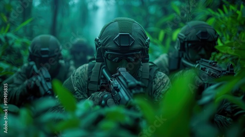Night vision view of operatives moving stealthily through a dense jungle, covert mission imagery