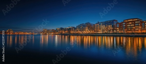 Nightfall Reflection: Waterfront Cityscape at Twilight