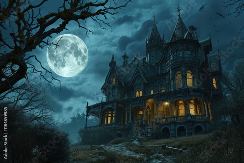 Nightmare Manor: A Creepy Halloween Illustration of a Haunted House Under Moonlight