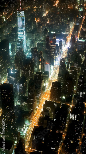 Nighttime Aerial View, Cityscape Illuminates Skyscrapers, Streets Glow with Vehicle Lights