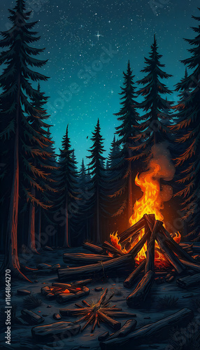 Nighttime Campfire in a Majestic Evergreen Forest under a Starlit Sky A Serene and Tranquil Scene of Nature's Beauty