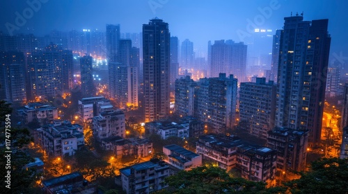 Nighttime Cityscape Dense High Rise Buildings Illuminated