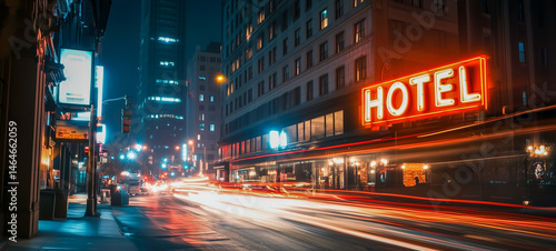 Nighttime cityscape featuring illuminated hotel sign and car lights