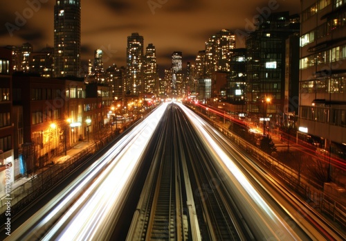 Nighttime Cityscape with Blurred Train Motion in Urban Environment Featuring Skyscrapers and Illuminated Buildings Under a Cloudy Sky