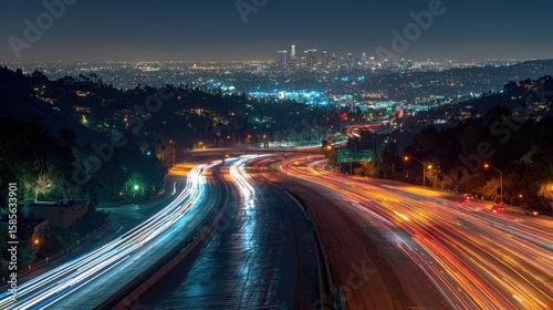 Nighttime cityscape with bright light trails on a busy highway leading toward illuminated downtown skyscrapers.