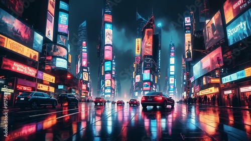 Nighttime Cityscape with Neon Lights and Reflective Street