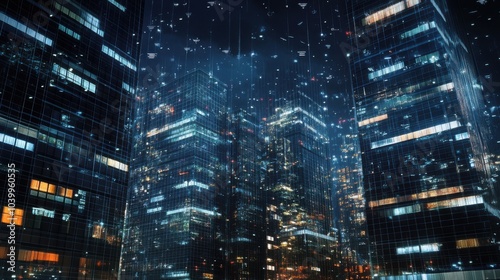 Nighttime cityscape with skyscrapers illuminated in the rain.