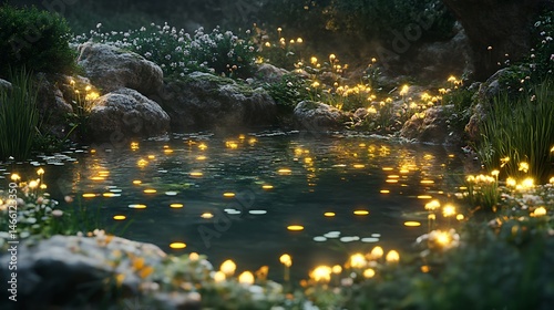 Nighttime forest pond surrounded by glowing flowers and magic high resolution picture