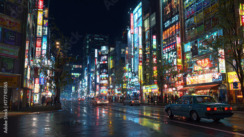 Nighttime in the vibrant city with illuminated buildings and a busy street scene. Cars navigate the wet road under the glow of neon signs