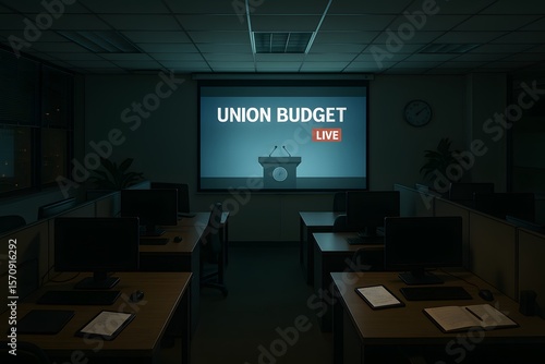 Nighttime IT Office in Bangalore Watching Union Budget Live on Projector with Computers and Notebooks