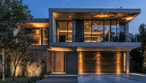 Nighttime Luxury Home with a Modern Concrete and Wood Exterior.