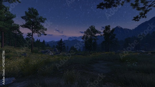 Nighttime Mountain Landscape With Starry Sky And Trees