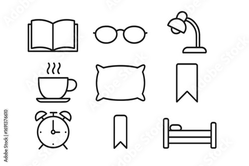 Nighttime Reading Essentials. Outline icon set of night reading setup: open book, glasses, lamp, coffee cup,