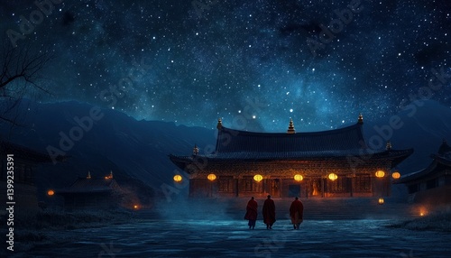 Nighttime Reverie: Monks Journeying Towards Illuminated Temple Under a Starry Canopy