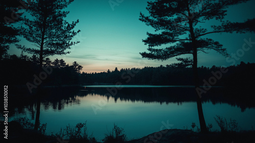 nighttime scene featuring a dark silhouette of trees along a lake. The sky transitions from deep blue to lighter shades, suggesting the approach of dawn or dusk