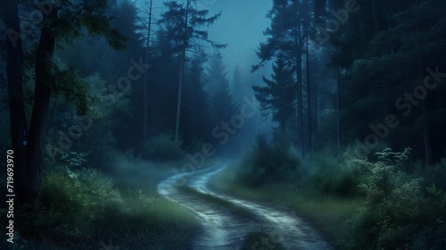 Nighttime scene of a misty forest, dark theme. with a road leading in to the forest