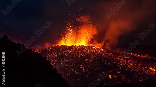 Nighttime volcanic eruption with lava fountains and glowing embers illuminating the dark landscape. generative ai