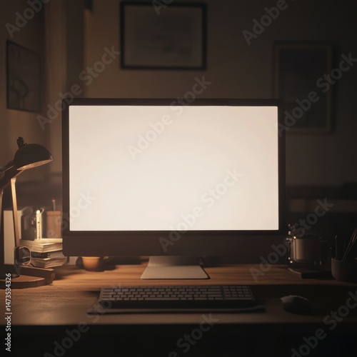Nighttime Workspace: Illuminated Computer Screen on Wooden Desk in Dimly Lit Room