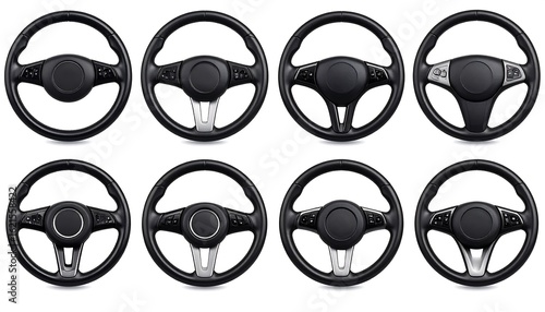Nine black car steering wheels, various designs