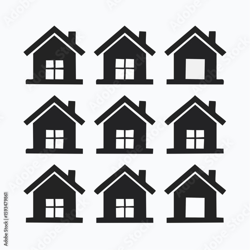 Nine Black House Icons with Varied Window and Door Designs.