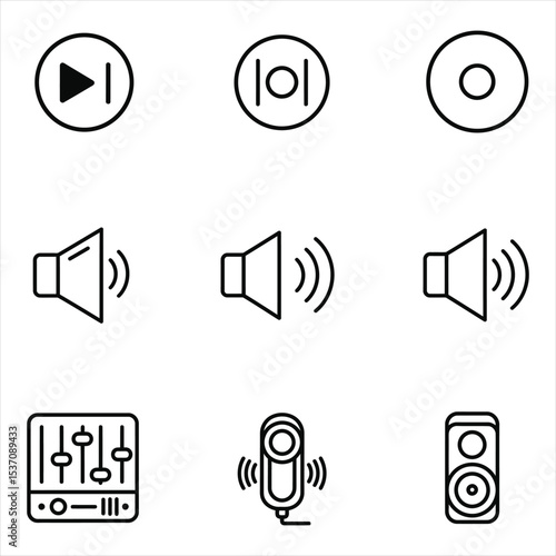 Nine Black Line Audio Icons on White Background Next Previous Play Pause Sound Speaker Mixer Microphone Subwoofer Vector Icons for Business, Web, UI/UX, and Design Projects