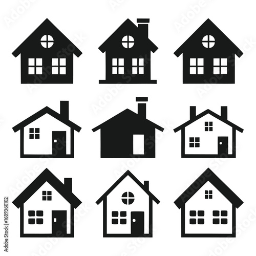Nine Black Silhouette House Icons In A Three By Three Grid On White home black and white