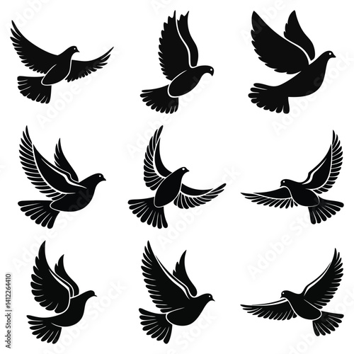 Nine Black Silhouettes of Doves in Flight Peace Symbols Illustration