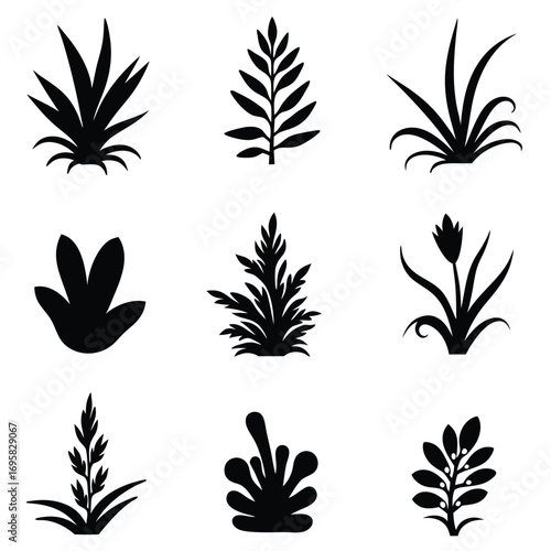 Nine black silhouettes of various plants and leaves