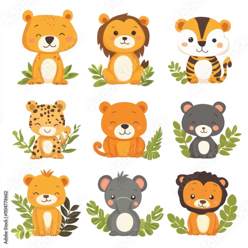 Nine cute cartoon animals lion, tiger, leopard, bear, and elephant.