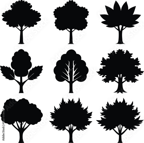 Nine Distinct Black Silhouette Tree Icons with Varied Foliage trees nature