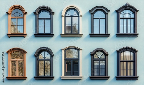 Nine Elegant Arch-Top Windows on a Light Blue Wall