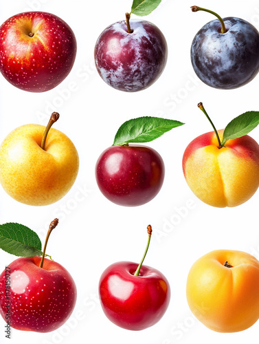 Nine fresh fruits; apples, plums, and apricots on white background.