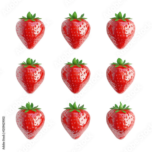 Nine glossy strawberries on a vibrant striped background,