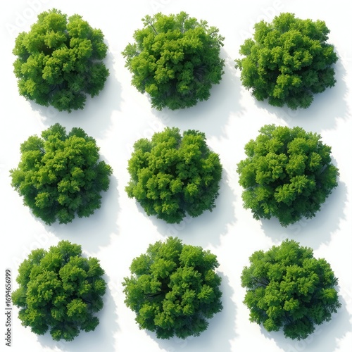 Nine green treetops viewed from above. Isolated on white background, verdant crowns represent nature, ecology, growth. Ideal for design projects needing organic, botanical elements. Tree displays