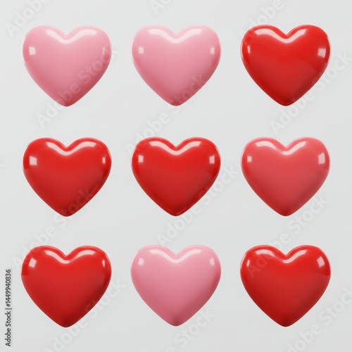 Nine hearts arranged in a grid pattern with pink and red colors on a light gray background surface