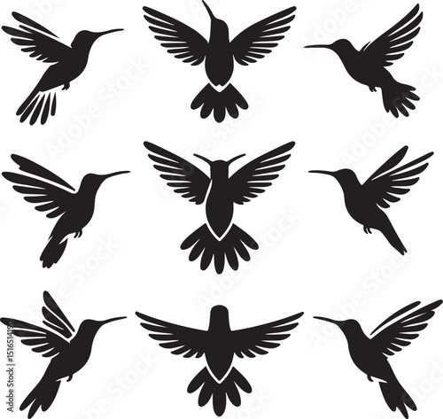 Nine Hummingbird Silhouettes in Various Flight Poses