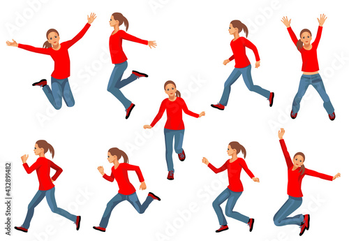 Nine isolated vector figures of a teenager girl running. jumping, dancing, raising hands
