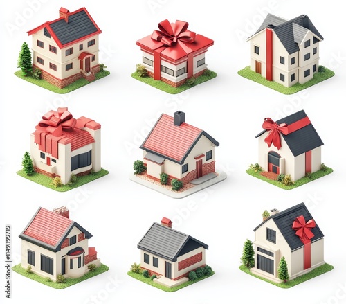 Nine isometric 3D models of houses, some wrapped as gifts.