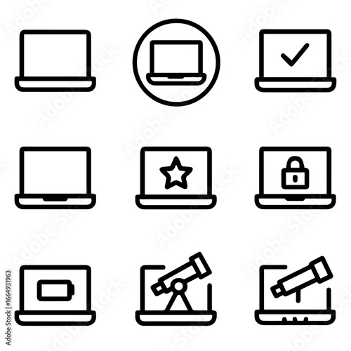 Nine Laptop Icons with Various Symbols Representing Different Functions and Concepts.