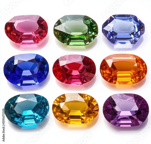 Nine polished oval gemstones in vibrant colors including pink, green, blue, red, orange, turquoise, yellow, and purple arranged in a 3x3 grid on a white surface, reflecting light beautifully
