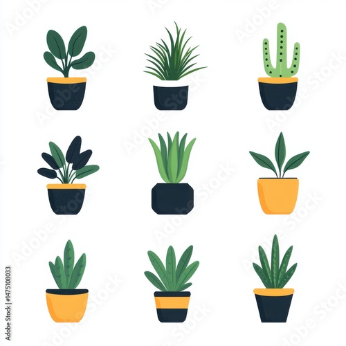 Nine potted plants illustration flat lay on white background featuring various houseplants including cactus succulent and leafy varieties