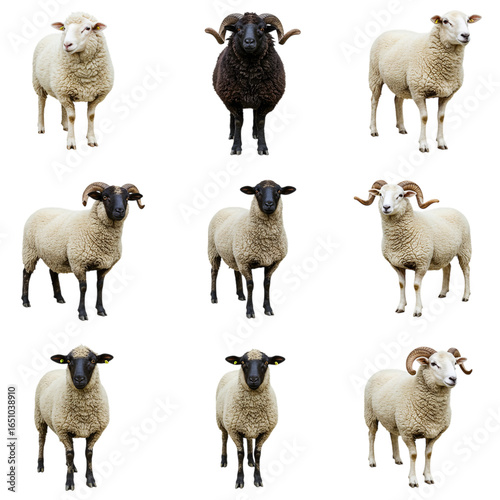Nine sheep and rams isolated on transparent background