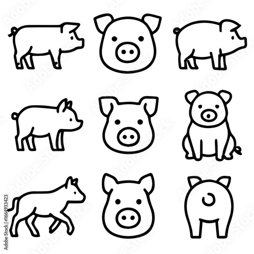 Nine stylized pig icons in various poses outlined in black on transparent background.