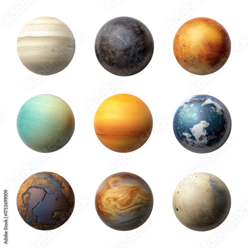 Nine stylized, round planets, diverse in color and texture, on a black background. Each planet displays unique patterns and hues, resembling digital renderings