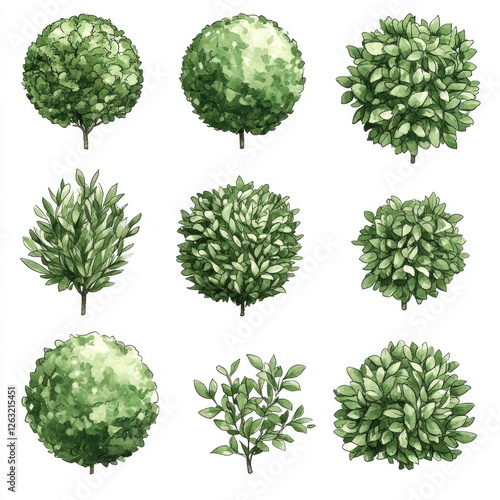 Nine Watercolor Illustrations of Lush Green Shrubs and Bushes