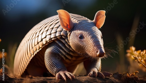 Ninebanded Armadillo Basking in the Sunlit Savannah at Dusk, Showcasing its Unique Camouflage Pattern and Earthy Tones, Evoking a Sense of Tranquility and Wildlife Wonder.