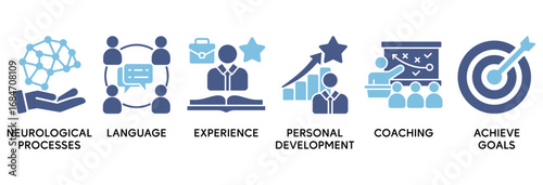 NLP icon set vector illustration concept relate to Neuro-linguistic programming with icon of neurological process, language, experience, personal development, coaching, and achieve goal