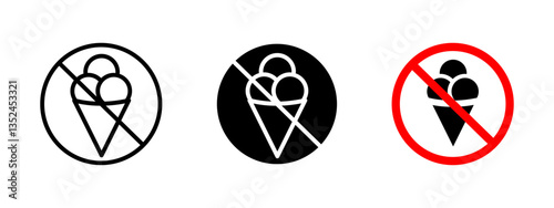 No ice cream icon. Prohibited dessert sign indicating restriction on eating frozen treats in specific areas. Food consumption regulation symbol for dietary or hygiene policies.